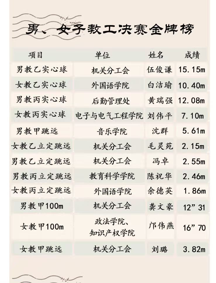 经过为期两天的激烈比拼,各分工会在精彩的运动会中取得了良好的成绩,第十八届教职工运动会获得优秀组织奖一等奖的2个分工会,分别是:食品与制药工程学院、教育科学学院。获得优秀组织奖二等奖的3个分工会,分别是:经济与管理学院、旅游与历史文化学院、环境与化学工程学院。获得优秀组织奖三等奖的5个分工会,分别是:中德设计学院、政法学院、生命科学学院、马克思主义学院、数学与统计学院。获得特别贡献奖的单位是:体育与健康学院。